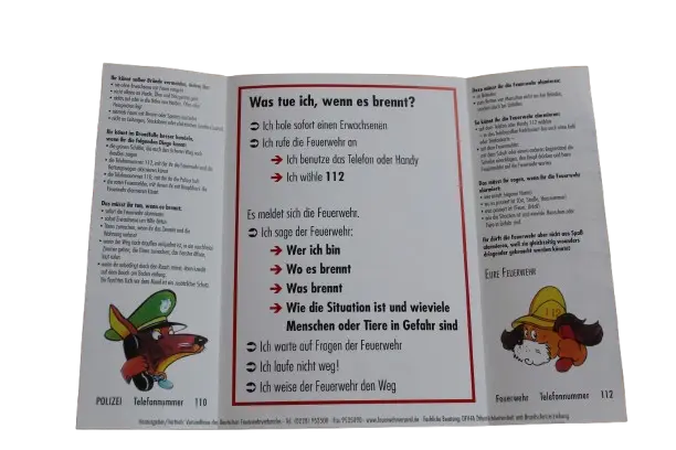 Das Kindermerkblatt „Ruf 112“ vermittelt auf kindgerechte Weise wichtige Informationen rund um den Brandschutz. In der praktischen DIN-A5-Altarfaltung finden sich anschauliche Hinweise zur Vermeidung von Bränden sowie sachliche Erklärungen, wie man sich im Brandfall richtig verhält.