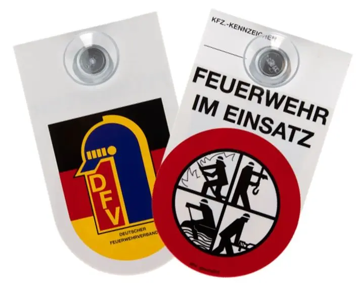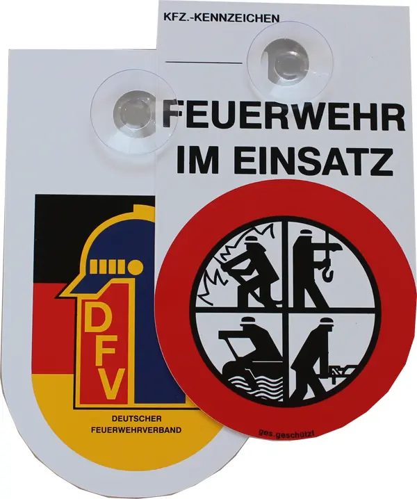 Das Auto-Kennzeichnungsschild dient der klaren Erkennbarkeit von Privatfahrzeugen im Einsatz. Die Vorderseite zeigt den roten Aufdruck „Feuerwehr im Einsatz“ mit Feuerwehr-Signet. Zusätzlich bietet die Vorderseite ein Feld zur individuellen Eintragung des eigenen Kfz-Kennzeichens. Die Rückseite ist mit dem Helm-Logo des Deutschen Feuerwehrverbands (DFV) bedruckt.