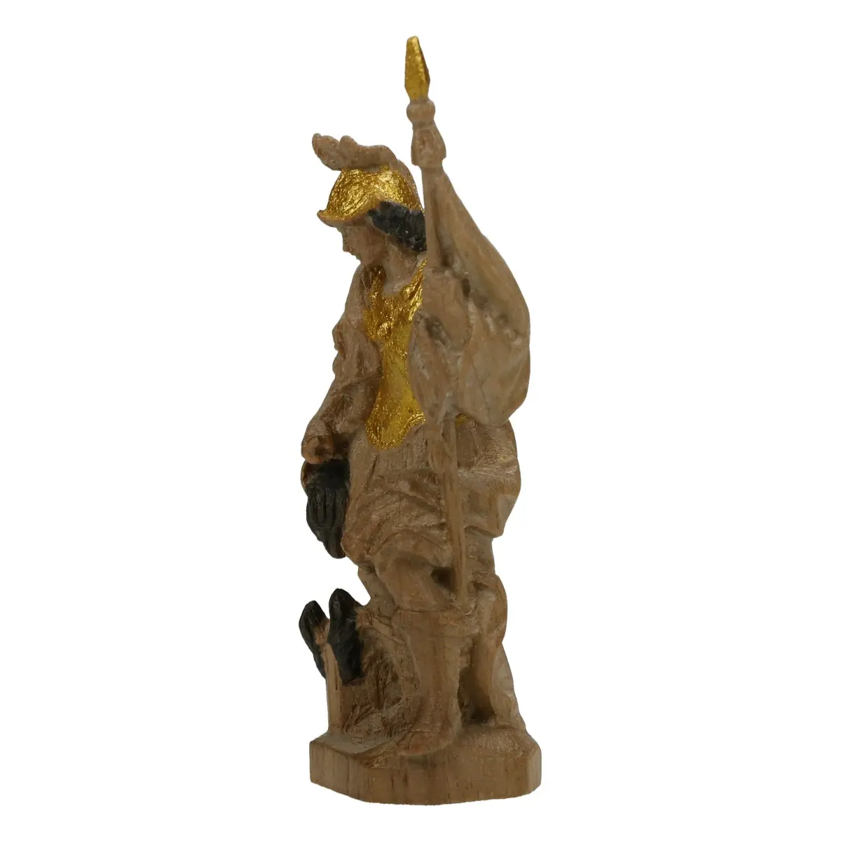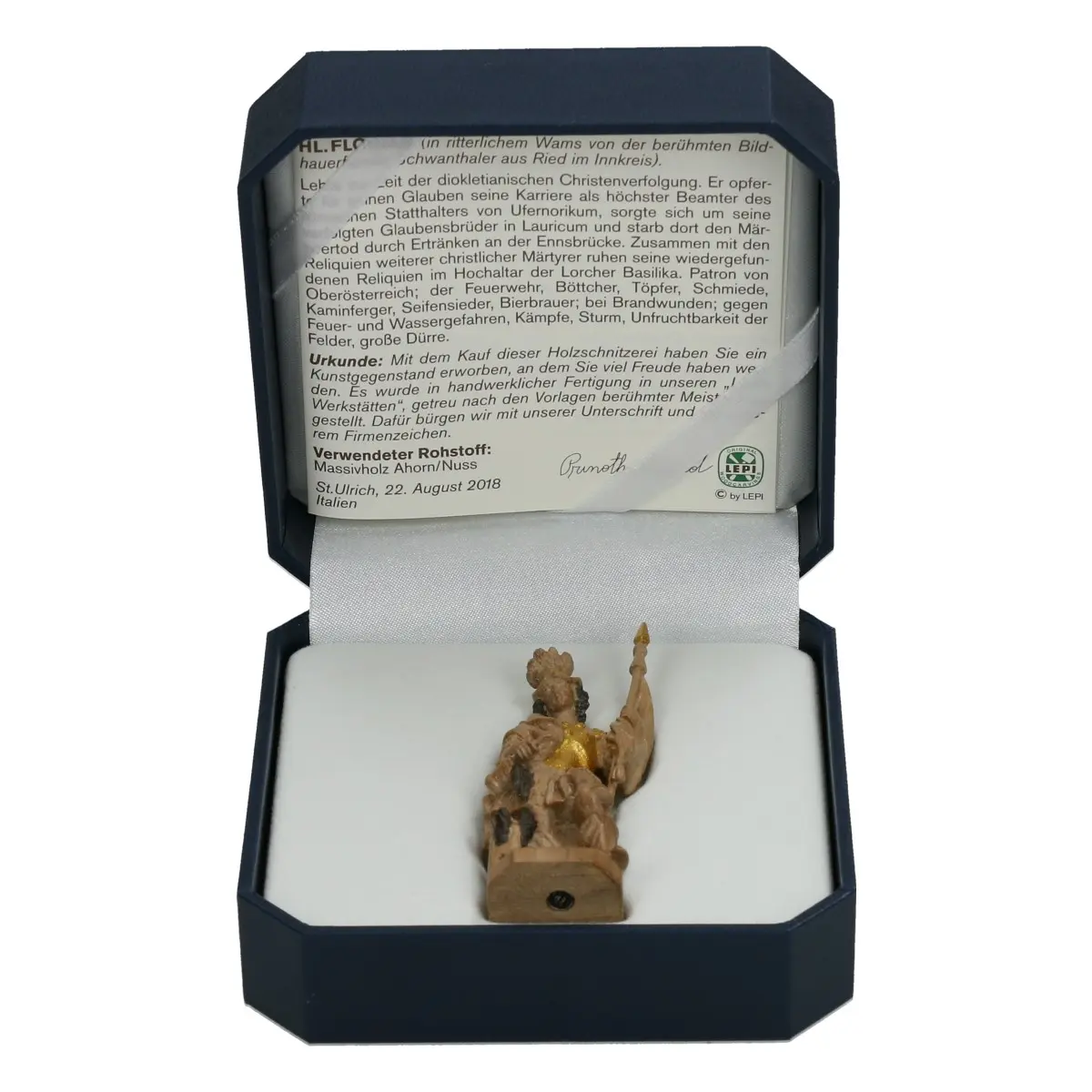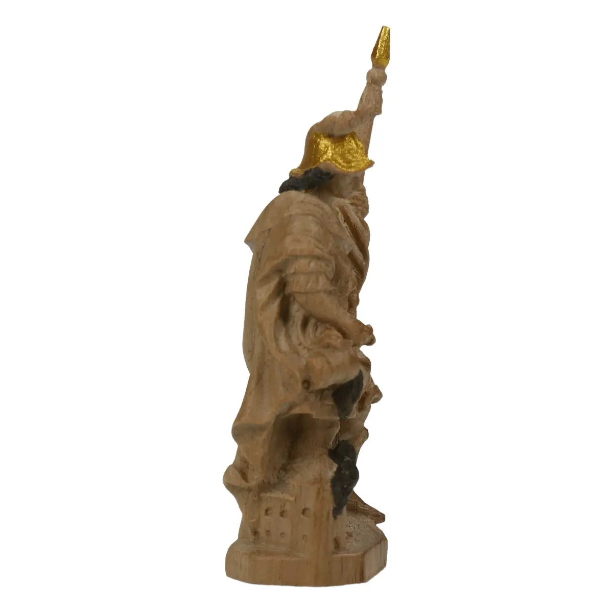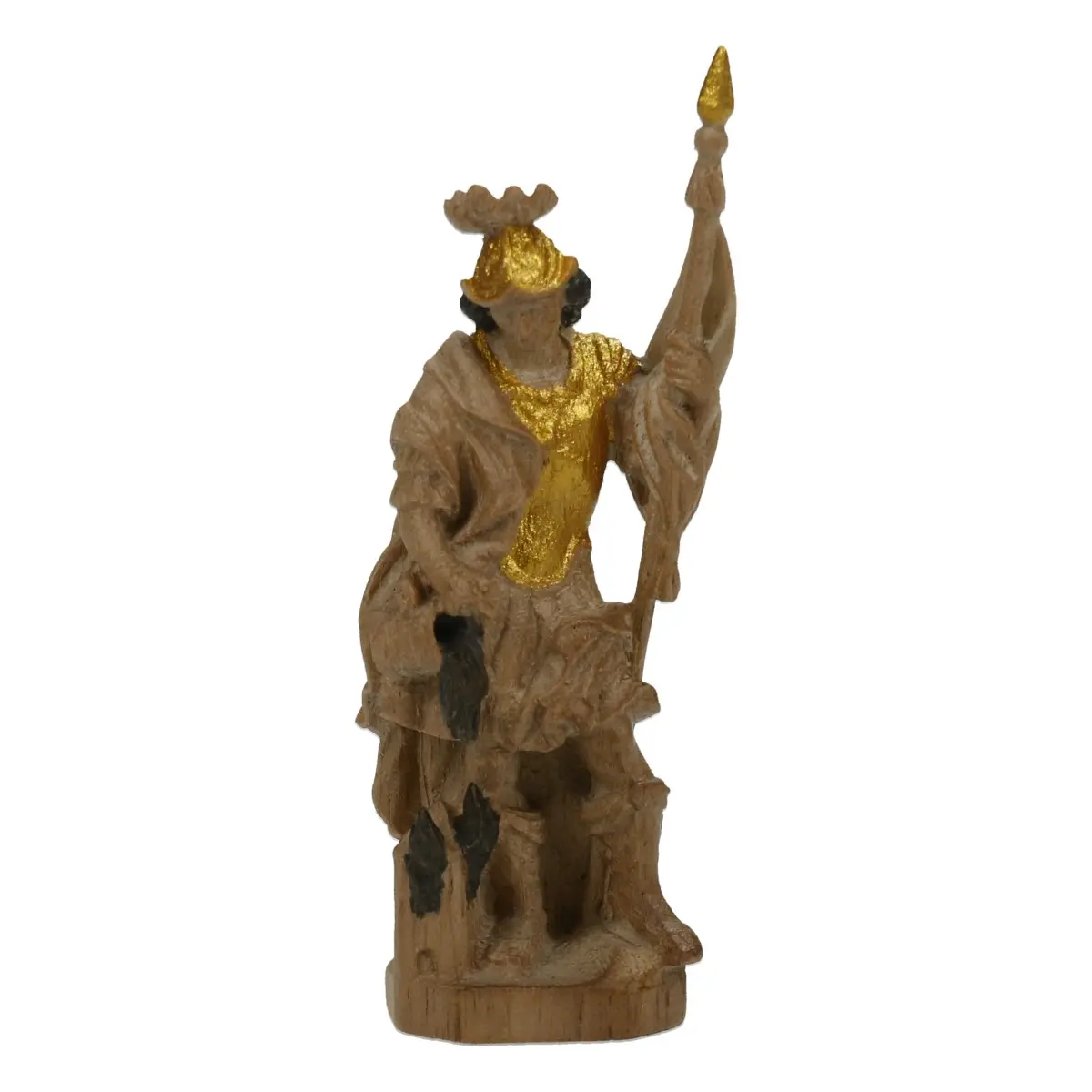 Der Original Grödnerthaler Schwanthaler Florian zeigt den Schutzpatron der Feuerwehr in edler Ausführung. Die 6 cm große Figur ist aus einheimischem Nussholz gefertigt, mit Wachs poliert und zusätzlich gold gefasst. Das Zusammenspiel aus natürlicher Holzstruktur und goldenen Akzenten verleiht ihr eine besonders wertige Erscheinung.