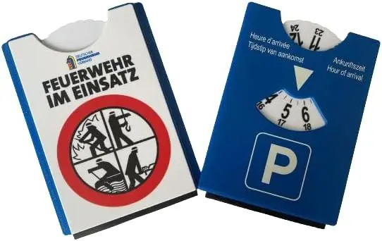 Diese praktische Kombination aus Parkscheibe und Kennzeichnungsschild ist ideal für Feuerwehrangehörige, die im Einsatz oder bei Diensten mit dem Privatfahrzeug unterwegs sind.