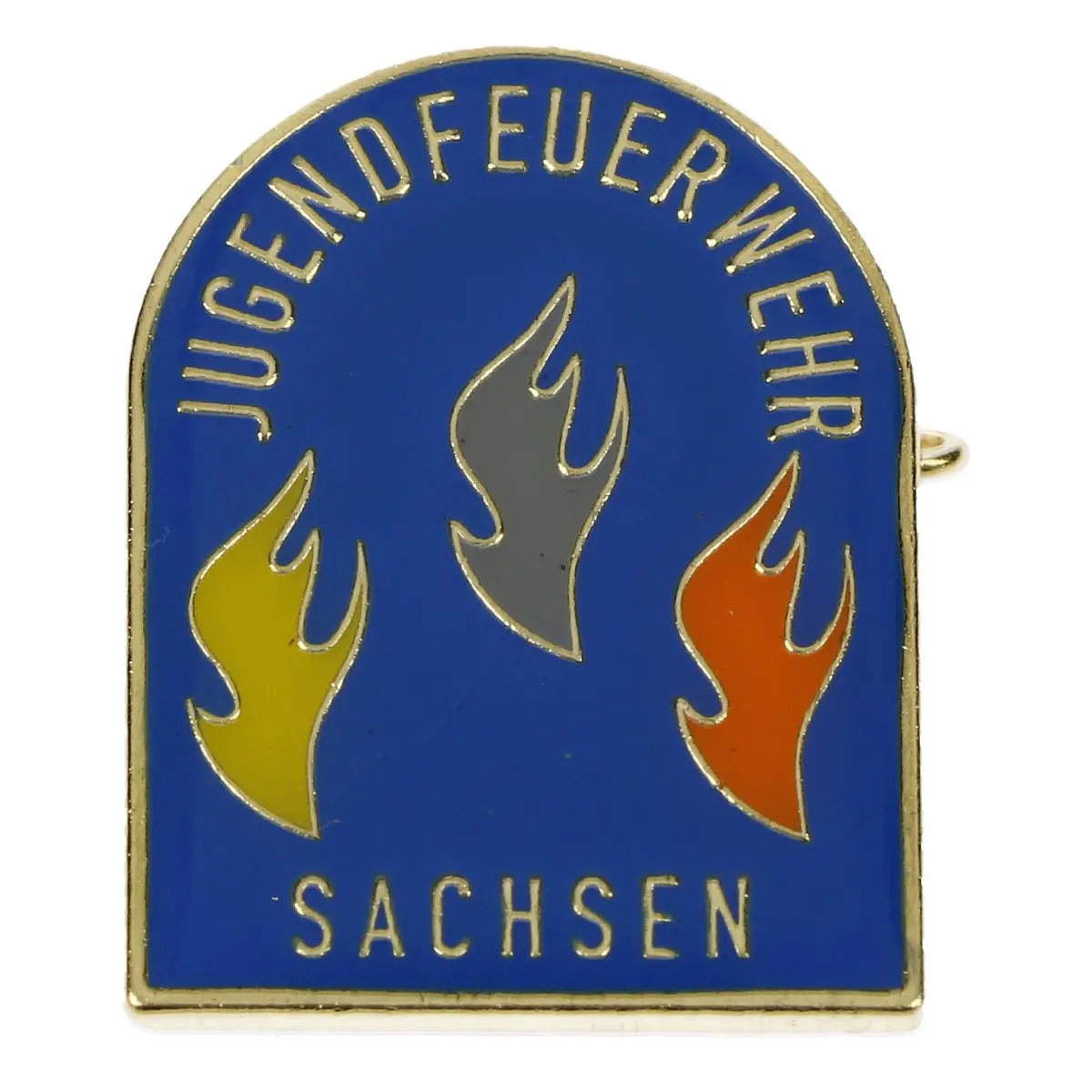 Das Abzeichen zeigt die typische Wappenform mit stilisierter Flamme und der Aufschrift „Sachsen“. Es wird auf der linken Brusttasche des Übungsanzugs getragen und steht für den erfolgreichen Abschluss der zweiten Ausbildungsstufe innerhalb der Jugendfeuerwehr.