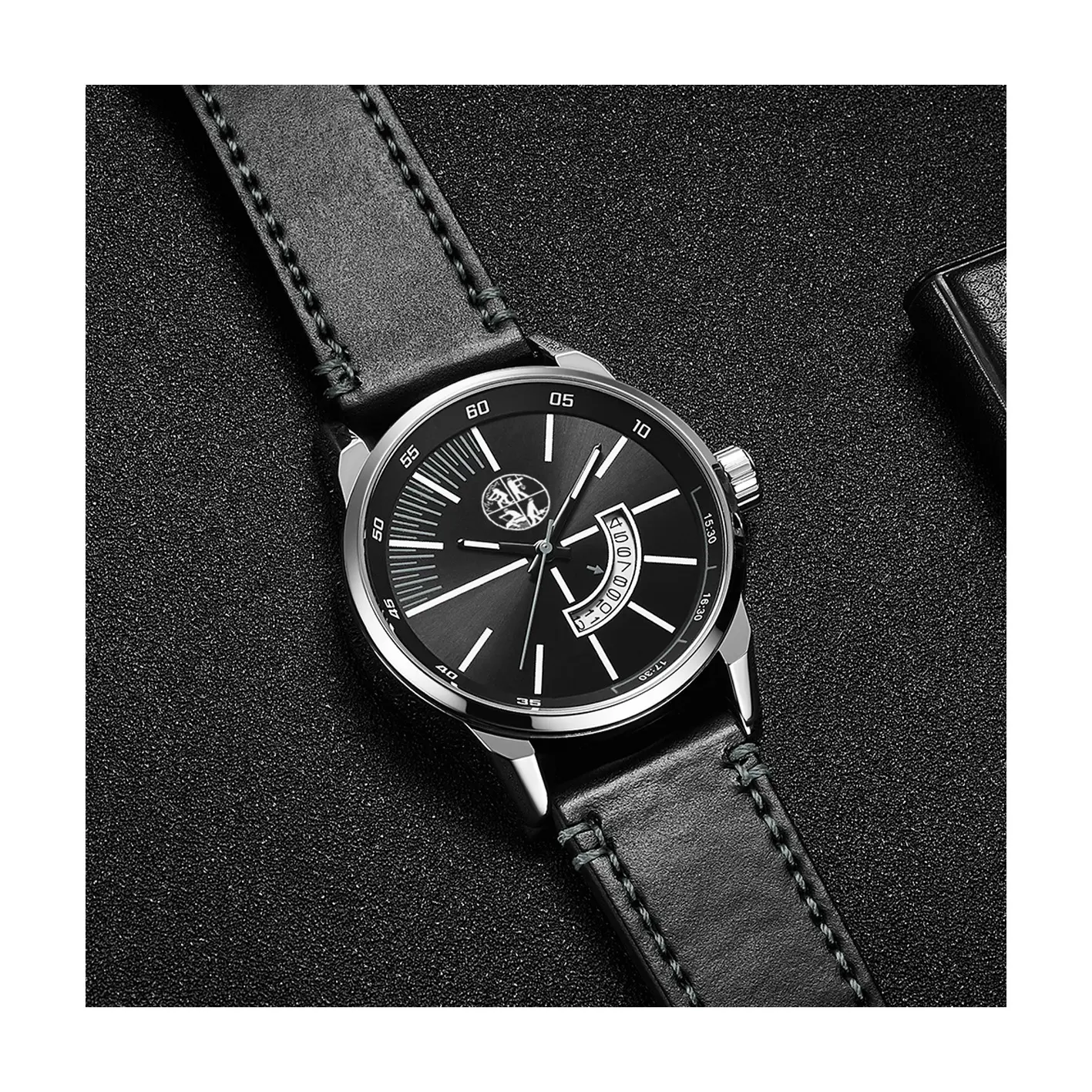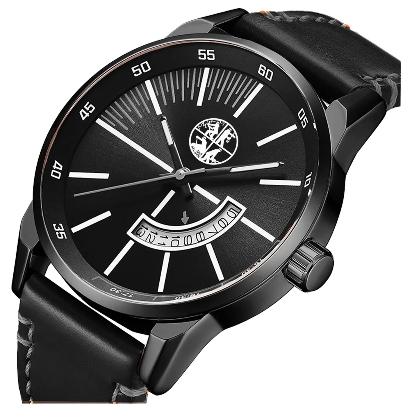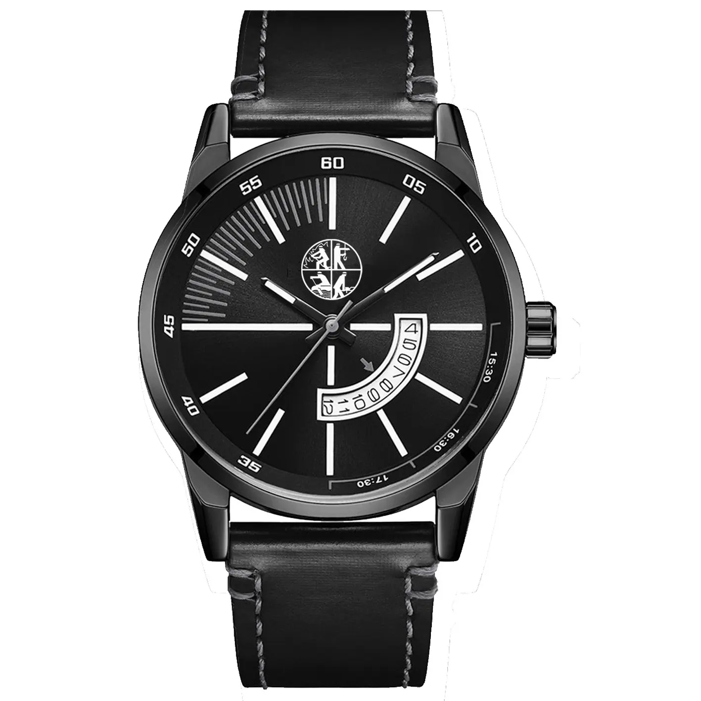 Klassisch elegante Herrenuhr mit Datumanzeige, Gehäuse in 46mm-BigSize mit ionischer Stahlbeschichtung in schwarz glänzend, aufwendig gearbeitetes Sonnenschliffzifferblatt, elegante nachleuchtende Zeiger, japanisches Markenlaufwerk mit offenen Datumfenster, robustes hochwertiges Kalbslederarmband, Kontrastnaht und Edelstahlschließe, stoßsicheres Mineralglas, Edelstahluhrboden, 3 ATM wasserdicht, 24 Monate Garantie