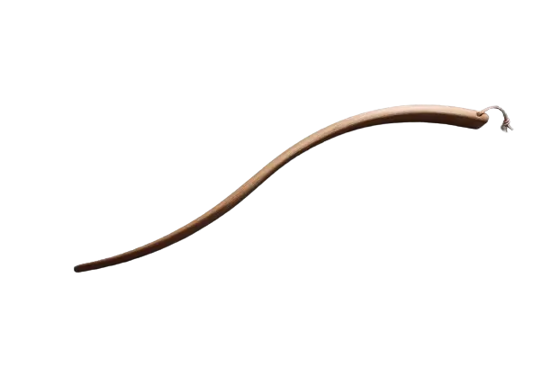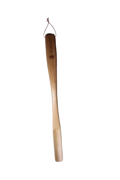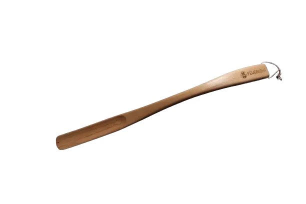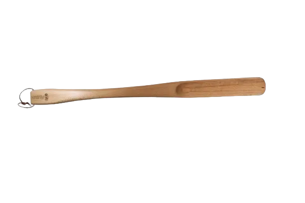 Holzschuhlöffel aus Buche, formverleimt, mit Lederschlaufe, transparent lackiert.
