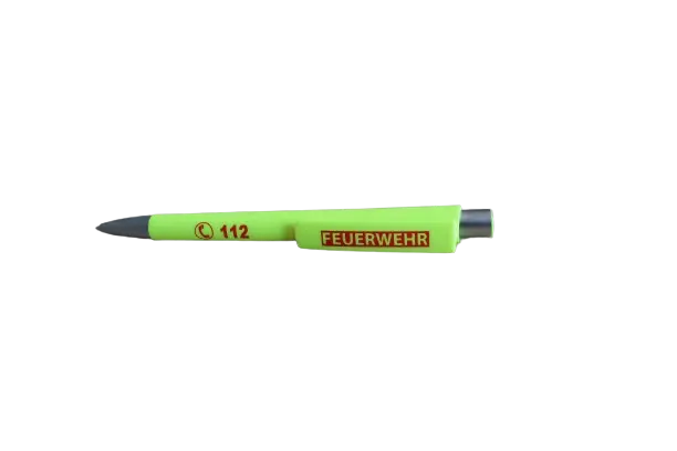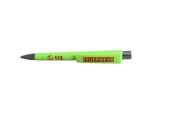 Ein kleines Schreibgerät mit klarer Botschaft: Der leuchtend neongelbe Kugelschreiber mit rotem „Feuerwehr“– und „112“–Aufdruck sorgt dafür, dass wichtige Notizen auch optisch mit Feuerwehrbezug genommen werden können.