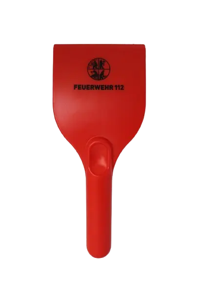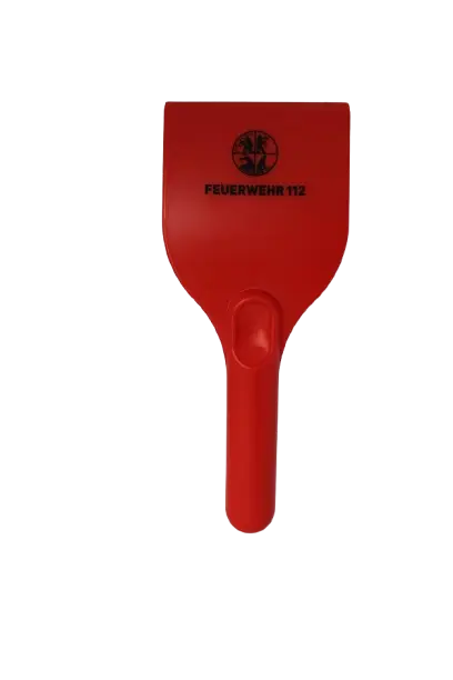 Der rote Eiskratzer trägt das Feuerwehr-Signet sowie die Aufschrift „Feuerwehr“ und liegt gut in der Hand. Ein praktischer Begleiter für alle, die auch im Winter klare Sicht behalten wollen.