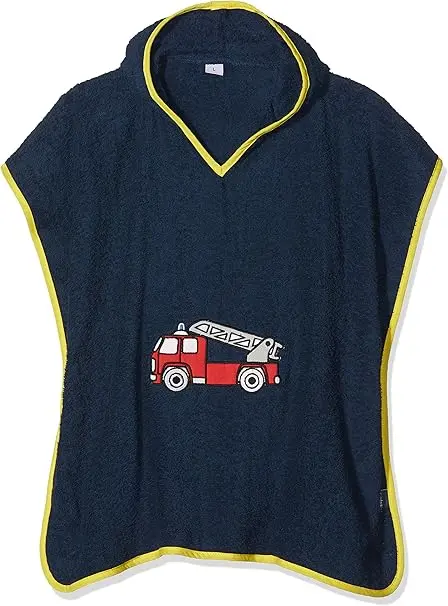 Zum Reinkuscheln nach dem Baden oder Duschen. Bade Poncho mit Feuerwehr Motiv aus 100 % Baumwolle, schön saugstark und kuschelig warm, ideal für Ihr frisch gebadetes Kind. Einfach über den Kopf ziehen, mit praktischer Kapuze und eingefasster Saumkante.