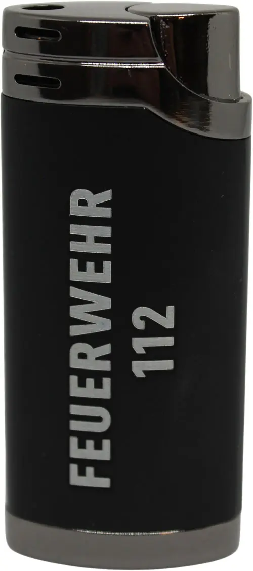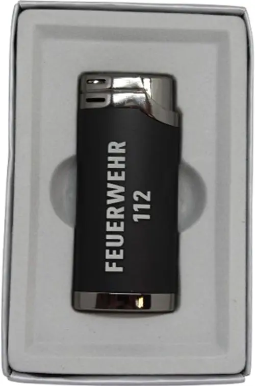 Metallfeuerzeug Feuerwehr 112, schwarz, Marke "Unilite", Modell "Bilbao", Format 67x29x16 mm, Soft Flame, nachfüllbar, einzeln im Karton.