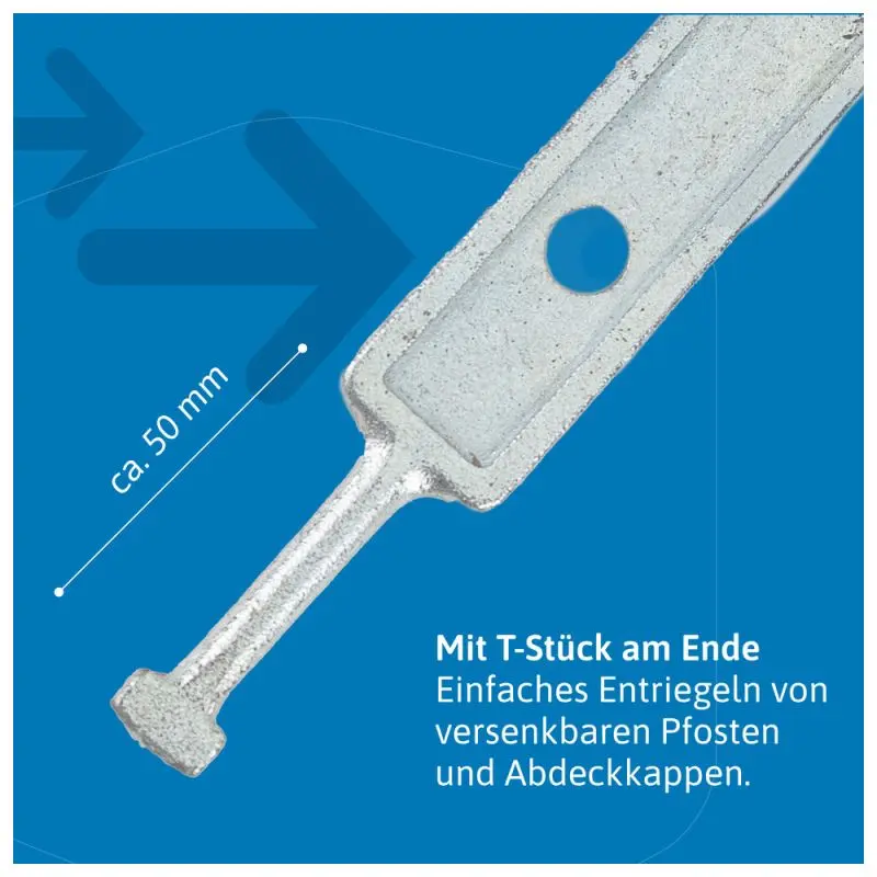 - T-Stück am Ende: Speziell für die Entriegelung von Abdeckkappen und versenkbaren Pfosten konzipiert.